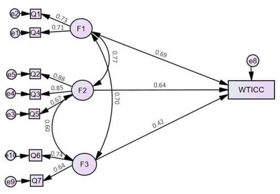 Measurement model. The effect of three factors (F) on willingness to include cultured meat in consumption. F1, ethical awareness; F2, ecological awareness; F3, belief in health benefits and safety; Q1–Q7, questions from the questionnaire; WTICC, willingness to include cultured meat in consumption.