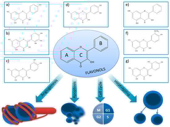 Structure of flavonols and effects on selected mechanisms: (a) kaempferol, (b) myricetin, (c) quercetin, (d) fisetin, (e) galangin, (f) isorhamnetin, and (g) morin [17,18,19].