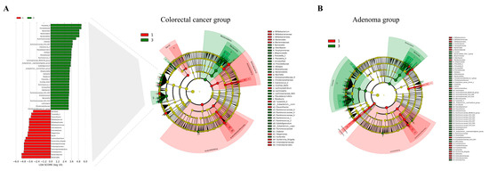 Gut microbiota composition comparison between type I and type III subtypes in CRC and CRA groups using LEfSe analysis. (A) LEfSe analysis of gut microbiota differences in the CRC group. Left panel: LDA score plot, with red bars representing type I taxa and green bars representing type III taxa. Right panel: cladogram displaying the phylogenetic distribution of differentially abundant taxa in the CRC group. (B) Cladogram illustrating the phylogenetic distribution of differentially abundant taxa between type I and type III subtypes in the CRA group, as analyzed by the LEfSe method. CRA, colorectal adenoma; CRC, colorectal cancer; LDA, linear discriminant analysis; LEfSe, linear discriminant analysis effect size.