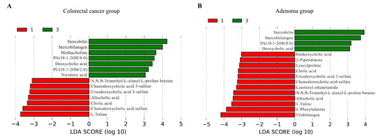 Differential metabolites between type I and type III subtypes in CRC and CRA groups identified by LEfSe analysis, with a logarithmic LDA score > 3. (A) LDA score plot for the CRC group comparison. (B) LDA score plot for the CRA group comparison. Red bars on the left represent type I, while green bars on the right indicate type III. Longer bars signify a greater degree of difference between the subtypes for each metabolite. CRA, colorectal adenoma; CRC, colorectal cancer; LDA, linear discriminant analysis; LEfSe, linear discriminant analysis effect size.