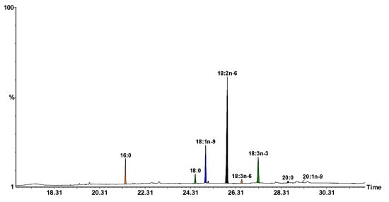 The results are shown in percentages from areas and presented in Table 5 and Table 6, and Figure 2. As can be observed in Table 6, the highest percentage of fatty acids is represented by polyunsaturated fatty acids, PUFAs, which are crucial, as they are considered indirect antioxidants []. The ratio between n-6 and n-3 (n-6/n-3), which is the most important for the prevention of various diseases [] is also presented in Table 6. The n-6/n-3 ratio is 4.41 and appears to be optimal for preventing and inhibiting disease progression.