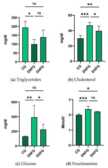 There were significant differences in glucose and cholesterol concentrations (between the DNFG and DHFG). Regarding triglyceride blood concentration, there were significant changes p ≤ 0.05 (*) between the CG and DNFG groups. The cholesterol concentration increased significantly in the diabetic groups compared to the control, with a specification that the hemp seeds decrease the effects of diabetes, p ≤ 0.001 (***). As expected, glucose and fructosamine followed the same trend; more significantly, fructosamine had p ≤ 0.001, (***) compared to glucose, which had p ≤ 0.01 (**), regarding CG and DNFG.