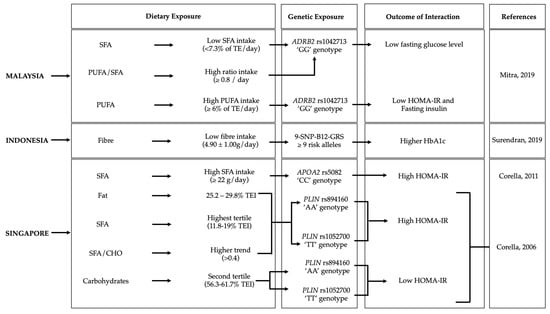 Gene–diet interactions on diabetes-related traits. The figure shows the significant gene–diet interactions (p < 0.05) on diabetes traits and the dietary factors that influenced the risk of diabetes in individuals carrying specific genetic variations in the Malysian [], Indonesian [] and Singaporean [,] populations. GRS, genetic risk score; BMI, body mass index; SFA, saturated fatty acids; PUFA, polyunsaturated fatty acids; HOMA-IR, homeostatic model assessment—insulin resistance; TE, total energy.
