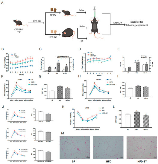 3.1. Intragastric SY Ameliorates HFD-Induced Obesity and Systemic Metabolic Dysfunction