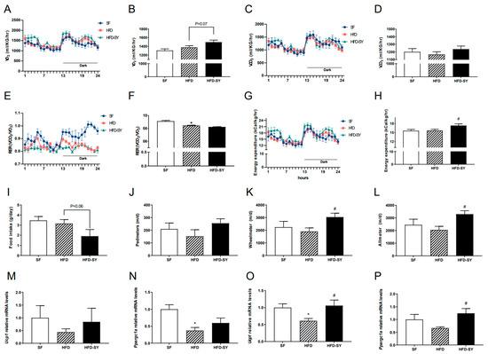 Intragastric SY increased the energy expenditure of DIO mice. Mice were treated with SY by gavage for 10 weeks, then (A,B) Oxygen consumption (VO2) of mice, (C,D) CO2 production (VCO2) of mice, (E,F) Respiratory exchange ratio (RER) of mice, (G,H) Energy expenditure (EE) of mice, (I) Food intake of mice, (J) Pedmeters, (K) Wheelmeters and (L) Allmeters of mice, (M,N) The mRNA levels of uncoupling protein 1 (Ucp1), peroxisome proliferative activated receptor, gamma, coac-tivator 1 alpha (Ppargc1a) in subcutaneous adipose tissue, (O,P) The mRNA levels of Ucp1 and Ppargc1a in brown adipose tissue. The data were represented as the mean ± S.E.M. (n = 5 in each group). *: vs. SF group, p < 0.05; #: vs. HFD group, p < 0.05.