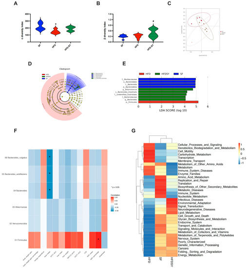 Further assessment of α diversity of gut microbiota indicated that HFD feeding notably impaired the richness of gut microbiota (p < 0.05), while SY treatment showed an increasing trend in the richness although no statistically significant differences were observed (Figure 5A). Moreover, the β diversity index demonstrated SY treatment evidently increased the richness of gut microbiota (Figure 5B, p < 0.05). The results of PcoA revealed that the gut microbial composition of HFD group and HFD-SY group was obviously separated (Figure 5C). LEfSe analysis was used to explore the unique gut microbiota among three different groups. Notably, phylum Bacteroidetes, class Bcteroidia, order Bacteroidales and family Muribaculaceae were the most overrepresented bacteria in SF group, phylum Firmicutes were mainly enriched in HFD group, while family unidentified_Clostridiales, family Bacteroidaceae, Bacteroides, Butyriciococcus and Bacteroides_intestinalls were the most strongly associated with HFD-SY group (Figure 5D,E). The relationship between the metabolic phenotypes and gut microbiota was further analyzed by the Spearman’s correlation analysis. As shown in Figure 5F, Bacteroides, Bacteroides_acidifaciens and Bacteroides_intestinalls were negatively correlated with food intake, while Firmicutes was positively correlated with WAT percentage of DIO mice. In addition, PICRUSt was used to predict the functional differences of the gut microbiota among three groups. Interestingly, both SF group and HFD-SY group were positively related with energy metabolism, lipid metabolism, and endocrine system, while HFD group were negatively related with the above pathways (Figure 5G). The above results indicated that intragastric SY might increase the energy metabolism and lipid metabolism by influence the composition and function of gut microbiota.