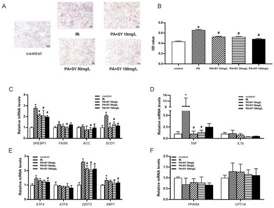 Next, we investigated the effect of different doses of SY on hepatocytes. As shown in Figure S3, the cell viability of HepG2 cells was not significantly decreased until the concentration of PA increased to 0.6 mM/L. Therefore, 0.4 mM/L PA was used to establish MAFLD hepatocyte model in vitro. More and larger lipid droplet were observed in PA-treated HepG2 cells when compared with control cells, accompanied with upregulation of lipogenic genes, indicating the PA-induced MAFLD cell model was well-established (Figure 6A–C, p < 0.05). As presented in Figure 6A,B, 10–100 mg/L SY treatment conspicuously decreased the intracellular triglyceride contents of HepG2 cell and the intracellular triglyceride contents decreased to 73.8–80.5% of control cells, respectively (p < 0.05). Moreover, similar to the results obtained in liver tissue of SY-treated DIO mice, 10–100 mg/L SY treatment evidently decreased the SREBP1, FASN and ACC mRNA levels to 71.4–78.3% respectively (Figure 6C, p < 0.05). As for SCD1, there were about 50% reduction after 10–100 mg/L SY treatment. Moreover, the expression of ATF4, DDIT3 and XBP1, which were involved in ESR-related genes, also statistically decreased with different concentration of SY treatment (Figure 6E, p < 0.05). As for inflammation related genes, there was statistically great reduction after 10–100 mg/L SY intervention in TNF (Figure 6D, p < 0.05). Although the expression of IL1b showed no significant difference, there was downward trend in 10–100 mg/L SY group (Figure 6D). However, there was no statistical differences in the expression of fatty acid oxidation related genes including PPARa and CPT1a in HepG2 cells with or without SY treatment (Figure 6F).