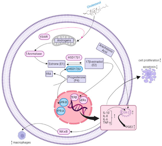 Molecular and inflammatory mechanisms driving EMS. The figure depicts the main alterations occurring in EMS. In particular, increased levels of CYP19A1 and StAR enzymes, together with reduced HSD17β2, boost E2 production. Concomitantly, ERβ over-expression triggers COXs expression/activation and PG increase. Resistance to P4, which normally elevates RA levels, hinders HSD17β2 expression in epithelial cells, thus contributing to enhancing E2 levels. Moreover, the rise in ER/ERβ ratio also promotes inflammation by enhancing cytokine expression (IL-1β, IL-8, IL-6, TNFα) and further stimulating COX-2 activity. This latter process metabolizes AA to produce PGE2. Inflammation drives NF-κB pathway activation, thus promoting macrophage recruitment. Created with biorender.com.