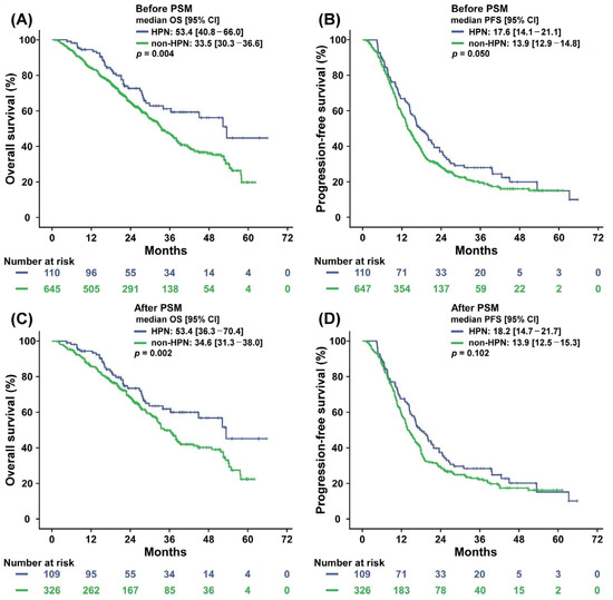 Figure 1 displays the Kaplan–Meier survival curves for the HPN and non-HPN program groups before and after PSM. After PSM was applied, the median PFS for the HPN program group was 18.2 (95% CI: 14.7–21.7) months compared with 13.9 (95% CI: 12.5–15.3) months for the non-HPN program group. PFS at 5 years was 14.4% in the HPN program group and 15.8% in the non-HPN program group; the 5-year PFS did not significantly differ between the groups (p = 0.102).