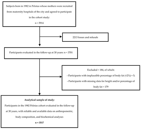 In the 1982 Pelotas cohort, the 30-year follow-up was conducted between June 2012 and February 2013, with an attempt to include all 5914 subjects from the initial cohort. A total of 3701 participants were interviewed, and, along with the 325 known deaths, this represented a follow-up rate of 68.1% [16,17]. The present study included data from 3517 adults after exclusion of subjects with implausible BF% (less than 2%; n = 5) and those with missing data (n = 179) (Figure 1).