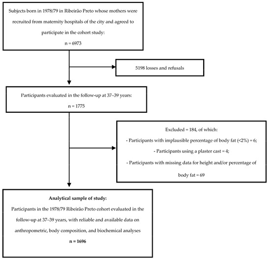 In the 1978/79 Ribeirão Preto cohort, an attempt was made in 2016/2017 to include all members of the original cohort (age 37 to 39 years). Out of the 6973 livebirths followed up with during the first phase of the cohort, 1775 were located and evaluated, representing 25.5% of the original cohort [17]. Subjects with BF% less than 2% (n = 6), subjects using a plaster cast (n = 4) and subjects with missing data (n = 69) were excluded from the present study, resulting in a final sample of 1696 adults (Figure 2).