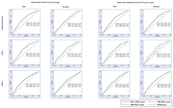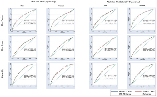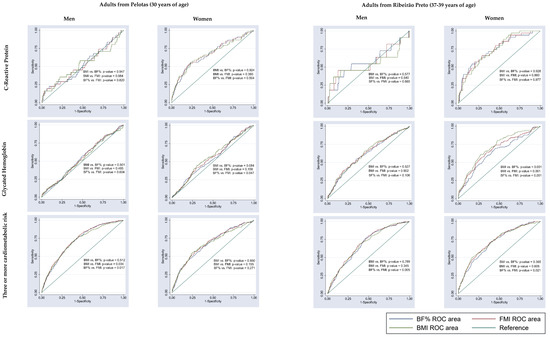 In adults from Ribeirão Preto, the cut-off points in men ranged from 26.1% (AUC: 0.651) to 27.8% (AUC: 0.614) for BF%, from 7.3 kg/m2 (AUC: 0.661) to 7.8 kg/m2 (AUC: 0.622) for FMI and from 28.3 kg/m2 (AUC: 0.672) to 29.0 kg/m2 (AUC: 0.624) for BMI. In women, these values ranged from 38.5% (AUC: 0.604) to 42.2% (AUC: 0.740) for BF%, from 10.2 kg/m2 (AUC: 0.620) to 12.2 kg/m2 (AUC: 0.740) for FMI and from 27.2 kg/m2 (AUC: 0.626) to 29.6 kg/m2 (AUC: 0.738) for BMI (Table 2).