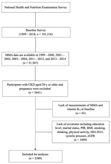 In our analyses, we used data from 51,507 participants in five NHANES circles (1999–2000, 2001–2002, 2003–2004, 2011–2012, and 2013–2014, respectively). MMA data were not available in NHANES 2005–2010. CKD was defined as an estimated glomerular filtration rate (eGFR) < 60 mL/min per 1.73 m2 or urinary albumin creatinine ratio (ACT) > 30 mg/g, and the eGFR was calculated using the Chronic Kidney Disease Epidemiology Collaboration (CKD-EPI) equation []. CKD was classified into 5 stages according to the Kidney Disease: Improving Global Outcomes (KDIGO) guideline: stage 1 (eGFR ≥ 90 mL/min/1.73 m2 with ACT > 30 mg/g), stage 2 (eGFR > 60 and <90 with ACT > 30 mg/g), stage 3 (eGFR > 30 and <60), stage 4 (eGFR > 15 and <30), and stage 5 (eGFR < 15 mL/min/1.73 m2), respectively []. We excluded participants without CKD (n = 46,887), those <20 years (n = 962), those with pregnancy (n = 17), those with missing MMA values (n = 38), those with missing vitamin B12 values (n = 5), and those with a lack of covariates (n = 1009) including education, marital status, poverty-to-income ratio (PIR), body mass index (BMI), smoking, drinking, physical activity, Healthy Eating Index-2015 (HEI-2015), systolic pressure, and eGFR. In total, 2589 participants with CKD were included and available for analyses (Figure 1).