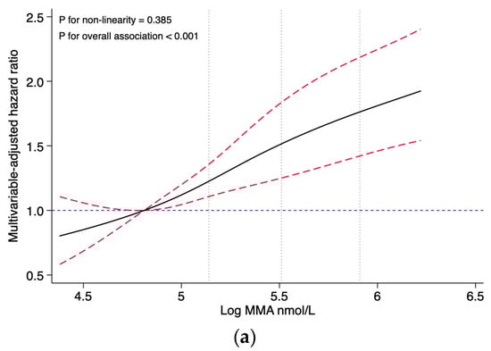 Restricted cubic splines presented no evidence for non-linear associations between the MMA levels and all-cause mortality (p for non-linearity = 0.385), nor with CVD mortality (p for non-linearity = 0.789) (Figure 2). After multivariable adjustment, the association showed a dose-response pattern, with a 30% increased risk of CVD mortality per unit increase in log-transformed MMA (HR, 1.30; 95% CI: 1.08, 1.57). When analyzing categorical MMA, compared with the reference group (first quartile, MMA < 123 nmol/L), the HRs (95% CI) of all-cause mortality with MMA 123–169 nmol/L, MMA 170–239 nmol/L, and MMA ≥ 240 nmol/L were 1.20 (0.91, 1.57), 1.28 (0.94, 1.76), and 2.01 (1.54, 2.62), respectively. Similarly, compared with the reference group (the first quartile), the HRs (95% CI) for CVD mortality were 1.29 (0.85, 1.97) for the second quartile, 1.04 (0.69, 1.58) for the third quartile, and 1.76 (1.18, 2.63) for the fourth quartile, respectively (Table 2).