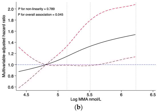 Association of the MMA levels with all-cause and CVD mortality, evaluated using restricted cubic splines. (a) Association of the MMA levels with all-cause mortality. (b) Association of the MMA levels with CVD mortality. Abbreviations: MMA, methylmalonic acid. Hazard ratios and confidence intervals were estimated for MMA using four knots placed at specific percentiles of the natural logarithm of MMA. The reference value was set at the 25th percentile, and the dotted vertical lines represent the 50th, 75th, and 90th percentiles, respectively. The results are presented using solid black lines for the hazard ratios, red dashed lines (indicating the 95% confidence interval) for the confidence intervals and blue dashed lines for hazard ratios for reference lines of 1.0. The model was adjusted for the NHANES circles, age (continuous, year), sex (male and female), race (Hispanic, non-Hispanic white, non-Hispanic black, and others), education (less than high school, high school, and college or higher), marital status (married, separated, and never married), PIR (≤1, 1–4, and ≥4), BMI (continuous, kg/m2), smoking (never, former, and current), drinking (never, former, and current), physical activity (low, moderate, and high), diet quality (continuous, HEI-2015 score), systolic blood pressure (continuous, mmHg), eGFR (continuous, mL/min/1.73 m2), and vitamin B12 (continuous, pmol/L). No non-linear association was observed between MMA and all-cause mortality (p for non-linearity = 0.385), and no non-linear association was observed between MMA and CVD mortality (p for non-linearity = 0.789).