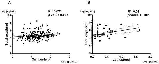 Correlation between total oxysterol level and cholesterol metabolism markers. The correlation of total oxysterol level and cholesterol metabolism biomarkers were shown. Panel (A) (Left) shows regression line of total oxysterol and campesterol. Panel (B) (Right) shows regression line of total oxysterol and lathosterol.