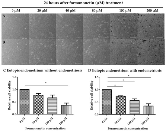 CCK8 assay showed decreased cell viability in eutopic endometrium without endometriosis (A,C) and eutopic endometrium with endometriosis (B,D) by increasing dose of formononetin (×40 magnification, bar scale 500 μm, * p < 0.05, N = 3 per group).
