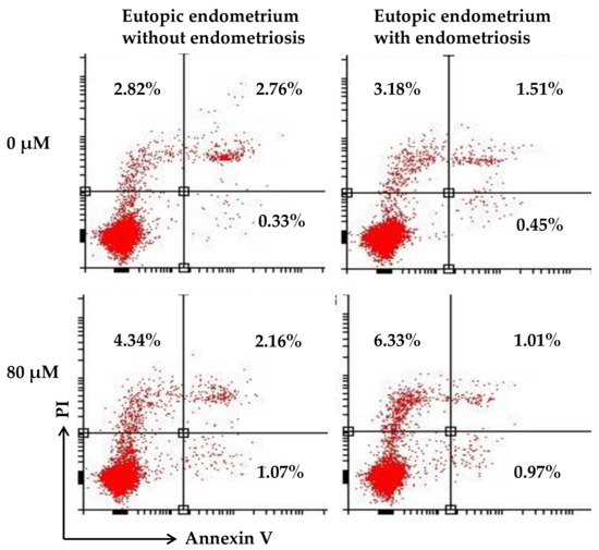 Annexin V- and PI-based apoptosis and necrosis discrimination assays were performed on eutopic endometria with and without endometriosis. The results showed that formononetin did not significantly induce apoptosis in eutopic endometrial cells with or without endometriosis in a dose-dependent manner (Figure 3).