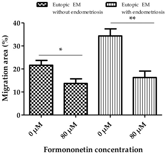 A wound healing assay was performed to investigate the anti-migratory effect of formononetin. In eutopic endometria without endometriosis, administration of formononetin induced a significant decrease in wound closure (21.62 ± 6.27 vs. 13.72 ± 5.99, p = 0.047). In eutopic endometrium with endometriosis, the reduction in wound closure was more prominent than control endometrium with statistical significance (34.37 ± 8.61 vs. 16.28 ± 8.45, p = 0.001) (Figure 4).
