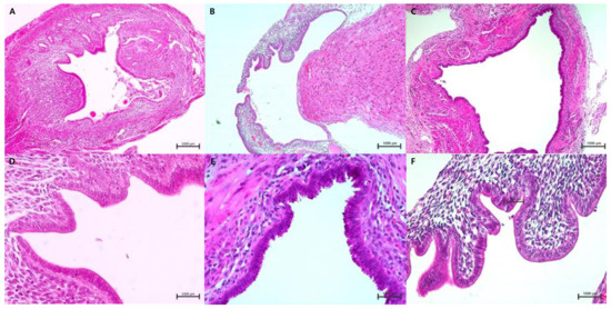 After formononetin treatment, 30 recipient mice were euthanized to confirm and collect endometriotic lesions. The endometriotic lesions were evaluated based on the number of implants (ea) rather than the area (ex. mm2) because all three groups had similar endometriotic implants (4 mm width × 2 mm length). An average of 3.2 ± 0.4 (1–5) endometriosis implants (ea) occurred in the control group not treated with formononetin. In the low-dose group, an average of 1.7 ± 0.4 (0–4) endometriotic implants were found in the low-dose group, which was significantly lower than that in the control group. In the high-dose group, an average of 2.0 ± 0.5 (0–6) endometriotic implants were identified in the high-dose group, which was significantly lower than that in the control group; however, it did not differ significantly from the low-dose group. The high-dose group showed greater heterogeneity than the other groups, ranging from zero to six implants. Furthermore, the formation of a characteristic chocolate-colored fluid containing an endometriotic cyst measuring 4 mm × 4 mm was also confirmed in one case (Figure 6). Retrieved endometriotic implants from the three groups were stained with H&E to confirm the presence of endometrial glands and stroma. The endometrial glands and stroma were observed in all three groups (Figure 7).