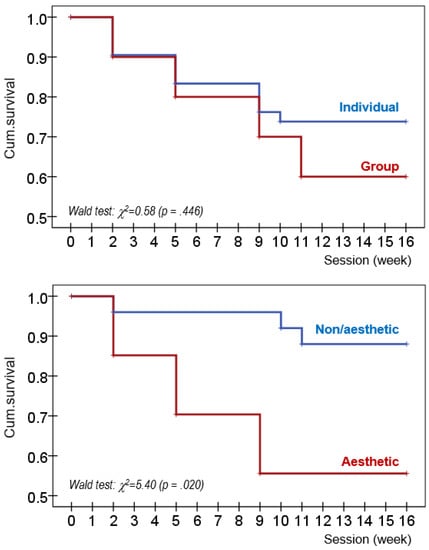 The second block in Table 5 shows the comparison between individual non-aesthetic sports versus individual-aesthetic sports. The aesthetic sports group was characterized by a higher mean in the EDI-2 drive for thinness, body dissatisfaction, ineffectiveness, perfectionism and total scale, as well as by a higher score in harm avoidance and a lower score in self-directedness. Differences in the treatment outcomes were also identified, such that aesthetic sports related to worse results during therapy (higher risk and rate of dropout, see Figure 1).