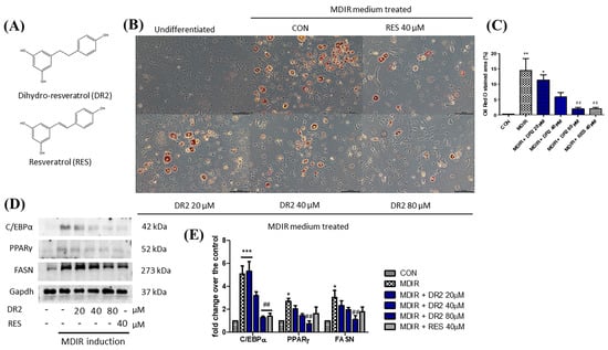 Effect of DR2 on adipocyte differentiation of 3T3–L1 cells. (A) Structures of dihydro–resveratrol (DR2) and resveratrol (RES). (B) The Oil Red O staining images and (C) quantifications of MDIR–stimulated 3T3–L1 cells with or without DR2/RES treatment. Scale bar = 100 μm. (D) Western blot results and (E) quantifications that indicated that DR2 reduced adipogenesis and lipogenesis markers in 3T3–L1 cells. * p < 0.05, ** p < 0.01 and *** p < 0.001 vs. CON group; ## p < 0.01 vs. MDIR group.