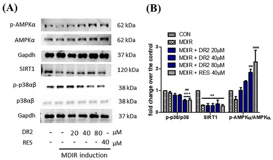 We also studied the effects of DR2 on the regulation of AMPK proteins. From Figure 3A, we observed that DR2 treatment could lead to dose-dependent upregulation of phosphorylated AMPKα (Thr172) and SIRT1. The results suggested that the effect of DR2 on activation of antioxidants is associated with activation of AMPK/SIRT1 cell signaling.