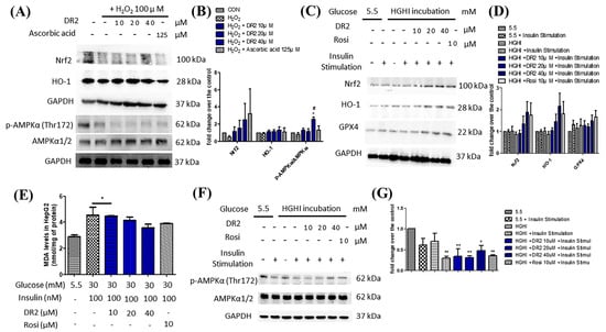It is suggested that high glucose levels will increase ROS in cells and cause oxidative stress to the cells [29], leading to lipid peroxidation. Therefore, we examined the lipid peroxidation levels in HGHI-exposed HepG2 cells by using MDA assays. We observed that the MDA levels of HGHI-exposed cells were significantly upregulated when compared with HepG2 cells in the normal condition, while the DR2 treatment (10, 20 and 40 μM) could dose-dependently reduce the MDA levels, suggesting that DR2 treatment could reduce the ROS levels as well as lipid peroxidation in HGHI-exposed HepG2 cells (Figure 3E). We examined the expression levels of AMPK protein and the antioxidant proteins Nrf2, HO-1 and GPX4 in the HepG2 cells to reveal the reducing effect of DR2 on oxidative stress aggravation. We found that treatment of DR2 could upregulate Nrf2, HO-1, GPX4 and p-AMPK (Thr172) protein expressions dose-dependently. Our results demonstrated that DR2 could reduce the oxidative stress and lipid peroxidation by activating Nrf2, HO-1 and GPX4 proteins via phosphorylations of AMPK protein in HepG2 cells (Figure 3C,F).
