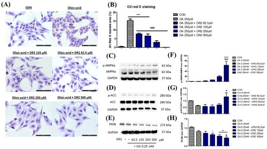Effect of DR2 treatment on oleic acid–stimulated HepG2 cells. (A) The Oil Red O staining images and (B) quantifications of oleic acid–stimulated HepG2 cells with or without DR2 treatments (62.5 µM to 500 µM). Scale bar = 100 μm. (C–E) Western blot results and (F–H) quantifications that indicated that DR2 is an in vitro ACC inhibitor via modulation of ACC/AMPK signaling in HepG2 cells. * p < 0.05, ** p < 0.01 and *** p < 0.01 vs. CON group; # p < 0.05 and ### p < 0.001 vs. OA group.