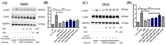 Effect of DR2 on insulin sensitivity of HGHI–exposed cell models. Western blot results that indicated that DR2 increased insulin sensitivity of insulin-resistant (A,B) HepG2 cells and (C,D) C2C12 cells via upregulations of phosphorylated AKT protein expression levels. Statistical significance considered as * p < 0.05, ** p < 0.01, *** p < 0.001 and n.s as no significance.
