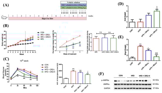 Effects of DR2 treatment on body weights and blood glucose clearance of HFD-treated C57/BL6 mice. (A) DR2 treatment period indication in high–fat–diet–fed mouse model. (B) Body weights of the experimental groups over the periods, percentage change of weights after DR2 or vehicle solution treatment and daily food intake between the high–fat–diet groups during treatment. (C) Intraperitoneal glucose tolerance test after 3 weeks of DR2 treatment. (D) qPCR analysis of liver Gck transcripts after 3 weeks of DR2 treatments. (E) qPCR analysis of iWAT Mcp1 transcripts after 3 weeks of DR2 treatments. N = 6–8 (F) Western blot result of hepatic p–AMPK and AMPK protein expression level after 3 weeks of DR2 treatments. N = 4 * p < 0.05, ** p < 0.01 and *** p < 0.001 vs. CON group; # p < 0.05, ## p < 0.01 and ### p < 0.001 vs. HFD group; n.s as no significance.