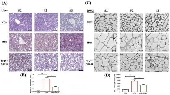 We employed tissue sectioning of liver tissues and inguinal white adipose tissues (iWAT) to visualize the lipid accumulation and adipocyte size to demonstrate the effects of DR2 on lipid aggregation and adipogenesis. We examined the effect of DR2 on hepatic lipid aggregation by Oil Red O staining. The visualized and quantitative data showed that the high-dosage DR2 treatment significantly reduced the enhanced hepatic lipid deposition of the high-fat-diet-fed mice (Figure 7A). From the H&E staining, a significant rise in the adipocyte size of the HFD group was observed while high-dosage treatment of DR2 could significantly reduce the adipocyte enlargement (Figure 7C). All these results were aligned with the results obtained through the in vitro cell models and demonstrated the effectiveness of DR2 administration in preventing lipid accumulation and adipocyte hypertrophy.