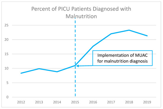 Figure 1 shows the percentage of admitted PICU patients who were identified as malnourished from 2012–2019. Following implementation of MUAC-based detection of malnutrition in 2015, we found more than 20% of PICU patients were reported as malnourished by 2017, and this level was consistently observed for the duration of our study. This finding suggests that MUAC is a practical tool for identifying patients with malnutrition in the PICU.