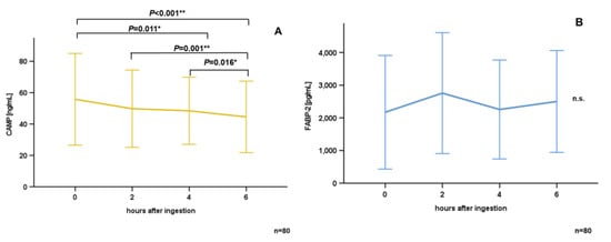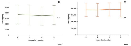 Systemic CAMP levels were quantified in serum samples obtained immediately before, 2 h, 4 h, and 6 h after oral lipid ingestion. As demonstrated in Figure 1A, mean CAMP serum concentrations were reduced 4 h (p = 0.011*) and 6 h (p < 0.001**) after oral lipid ingestion when compared to base-line levels. Furthermore, CAMP serum concentrations were reduced in a stepwise manner from 2 h to 4 h (p = 0.001**), and from 4 h to 6 h (p = 0.016*). Furthermore, FABP-2 (Figure 1B), FABP-4 (Figure 1C), and DPP-4 (Figure 1D) serum concentrations were measured at the determined time-points. Unlike CAMP, there was no significant modulation of these proteins after oral lipid uptake.