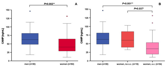 The sexual dimorphism of CAMP concentrations is caused by oral contraception. CAMP serum concentrations were measured in 80 volunteers. Men (n = 30) exhibit higher CAMP serum levels than women (n = 50, with and without oral contraception) (mean ± SD: men: 67.29 ng/mL ± 27.42; women: 48.88 ng/mL ± 28.39) (A). Women without oral contraception (n = 16) have higher CAMP serum levels than women taking oral contraceptives (n = 34), equaling men’s CAMP concentrations (B). CAMP serum concentrations were quantified by ELISA. The Mann–Whitney U test was applied for calculation of statistical significance (* p < 0.05, ** p < 0.01), and the data are presented as box plots. o.c. oral contraception. mean ± SD: men: 67.29 ng/mL ± 27.42; women no o.c.: 61.92 ng/mL ± 24.94; women with o.c.: 42.75 ng/mL ± 28.16.