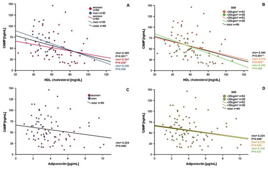 Correlation analyses of CAMP with metabolic serum parameters with significant results are summarized in Table 2A, insignificant results are shown in Supplementary Table S5. CAMP serum concentrations were negatively correlated with skinfold thickness (p < 0.001**), but there was no relation to other morphological markers of obesity, like waist-to-hip ratio, body weight, or BMI. A significant negative correlation of CAMP and skinfold thickness persisted after the exclusion of possible confounders by partial correlation analyses, like age, BMI, triglycerides, LDL cholesterol, or total cholesterol (Supplementary Table S2). HDL cholesterol levels correlated negatively with CAMP serum concentrations in the entire study population (p < 0.001**) (Figure 3A,B), as well as in subgroups of women (p = 0.030*) (Figure 3A), in patients with an BMI < 25 kg/m² (p = 0.006*) (Figure 3B), and in non-smokers (p = 0.002*) (Supplementary Figure S3), but not in subgroups of patients with an BMI ≥ 25kg/m², men, or smokers. This significant negative correlation persisted after exclusion of possible confounders by partial correlation analyses like age, BMI, triglycerides, LDL cholesterol, or total cholesterol (Supplementary Table S3). In contrast to HDL, LDL cholesterol levels correlated positively with CAMP serum concentrations in a subgroup of normal-weight patients with a BMI of <25 kg/m² (p = 0.013*) (Table 2B), low WHR (p = 0.018*) (Supplementary Figure S4A), and small skinfold thickness (p = 0.007*) (Supplementary Figure S4B). CAMP concentration correlated positively with triglycerides (p = 0.020*) in patients with BMI < 25 kg/m² (Table 2B). In patients with BMI ≥ 25 kg/m², CAMP serum concentrations correlated negatively with skinfold thickness (p < 0.001**) and insulin (p = 0.049*) (Table 2B). Adiponectin and CAMP correlated negatively in the entire study population (Figure 3C). Significant confounders might be age and BMI (Supplementary Table S4). This correlation did not reach statistical significance in the subgroups of normal weight and obese patients (Figure 3D). Systemic DPP-4 concentrations correlated positively with CAMP serum levels in patients with BMI ≥ 25 kg/m² (p = 0.004**) (Figure 3F, Table 2B) and with WHR > 0.84 (p = 0.007*) (Supplementary Figure S5A), in men (p = 0.018*) (Figure 3E), and in non-smokers (p = 0.001**) (Supplementary Figure S5B). The decrease in CAMP serum concentrations 6 h after oral lipid ingestion (ΔCAMP) correlated negatively with basal DPP-4 concentration, whereas other basal metabolic parameters, such as BMI, skinfold thickness, triglycerides, cholesterol, glucose, or insulin, were not correlated (Table 2A). Changes in metabolic parameters after oral lipid ingestion (Δ metabolic parameters) were not associated with the decrease in CAMP serum concentrations (Table 2A).