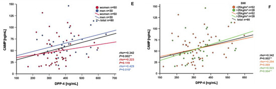 Negative correlation of CAMP serum concentrations with cardioprotective parameters, and positive correlation with DDP-4 serum levels in volunteers. Serum CAMP and HDL cholesterol levels are negatively correlated in the total study cohort of 80 volunteers without a history of diabetes mellitus, cardiovascular diseases or any kind of other known preexistent illness (A,B). This correlation is specific for the subgroups of women (A) and of normal weight individuals (B). Serum adiponectin and CAMP concentrations are negatively correlated (n = 80) (C,D). DPP-4 and CAMP levels are positively correlated, specifically in male (E) and overweight individuals (F). CAMP serum concentrations were measured by ELISA. Spearman-rho test was applied for calculation of correlation coefficient and statistical significance (* p < 0.05, ** p < 0.01).