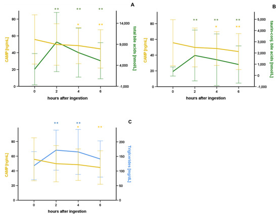 With serum levels of bile acids having been described earlier [21], we now investigated a potential interrelation of bile acids and CAMP in serum after oral lipid ingestion for the first time. Importantly, basal CAMP concentrations correlated negatively with taurine-conjugated bile acids (p = 0.013*), but not with total, free, or glycine-conjugated bile acids (Table 3). Furthermore, the decrease in CAMP serum concentrations (ΔCAMP) within 6 h (p = 0.001**) and 2 h (p < 0.001**) was significantly correlated with basal taurine-conjugated bile acid levels (Table 3). In the subgroup of patients with BMI ≥ 25 kg/m², serum CAMP concentrations were negatively correlated with taurine- (p = 0.001**) and glycine-conjugated bile acid levels (p = 0.044*), but not in patients with BMI < 25 kg/m² (Table 3). Insignificant correlation analyses of CAMP and bile acids are shown in Supplementary Table S6. The decrease in CAMP concentrations was associated with, and paralleled by, a substantial initial increase in total bile acids (Figure 4A), taurine-conjugated bile acids (Figure 4B), and triglycerides (Figure 4C).