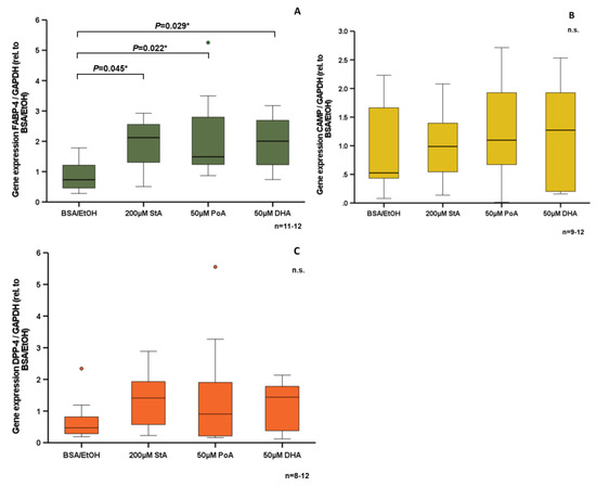 Free fatty acids induce FABP-4 gene expression in SGBS adipocytes in vitro. SGBS adipocytes were stimulated with 200 µM StA (stearic acid), 50 µM PoA (polyamic acid), and 50 µM DHA (docosahexaenoic acid) in vitro. Compared to solvent control BSA/EtOH (bovine serum albumin/ethanol), FABP-4 mRNA levels were increased by stimulation with free fatty acids (A). CAMP (B) and DPP-4 (C) gene expression were not affected by free fatty acids. Gene expression levels were analyzed by quantitative real-time PCR. The Kruskal–Wallis test was applied for calculation of statistical significance (* p < 0.05). N = 8–12 wells were investigated per experimental setting. n.s.: not significant.