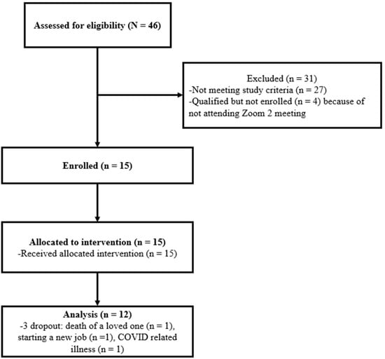 Two participants (2/15, 13.4%) dropped out immediately after completing the week 1 web part I intervention because of the death of a family member and starting a new job, respectively. An additional woman dropped out after completing the week 2 intervention due to COVID-19-related illness. These led to an 80% (12/15) retention rate at the end of the study (Figure 1). Of the 12 women who completed the study, everyone (100%) completed the three weekly web intervention activities (both parts I and II) and joined the three online health coaching sessions (100%).
