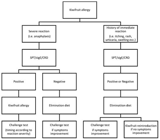 Diagnostic flowchart. Patient personal histories of severe reactions need to be tested via SPT, RAST, and CRD. Anaphylaxis is indicated by “severe reaction”. In this case, if the laboratory test result is positive, a food allergy is claimed; the timing for the challenge test is decided after considering the clinical response and the outcome of the CRD test. If the serological exams are negative, a focused elimination diet should follow. Based on the diet change response, the challenge test becomes worthy in revealing the diagnosis. The diagnostic process is similar in patients with immediate nonsevere reactions after kiwifruit ingestion, such as rash, urticaria, dyspnea, intense coughing, swelling of tongue, lips, and extremities, and itching. Apart from the results of the diagnostic tools, an elimination diet should be implemented. If relief from symptoms is achieved, the challenge test should be performed; on the contrary, it is possible to reintroduce the food, especially with negative serum diagnostic test results (including the CRD) []. In this case, there is no evidence to claim the specific kiwifruit allergy.
