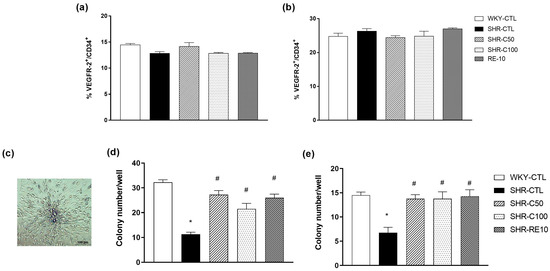 Effect of carvacrol treatment on CFU expression in EPC cultured 7 days after treatment. Characterization of the EPC population confirmed by the expression of VEGFR-2 and CD34 in the bone marrow, (a) peripheral circulation, and (b) cultured cells. Representative image of CFU evaluated after seven days of cell culture (c). Number of CFU after seven days of cell culture of cells isolated from bone marrow (d) and peripheral circulation (e). Results are expressed as the mean ± e.p.m. The ANOVA test was used for the statistical analysis, followed by Tukey’s post-test. * p < 0.05 vs. WKY-CTL; # p < 0.05 vs. SHR-CTL.