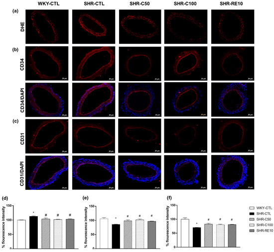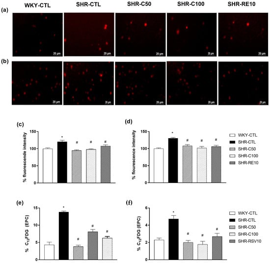 Similar results were observed in the EPC derived from the peripheral circulation, where the levels of DHE fluorescence intensity of the WKY-CTL group (100.0 ± 2.1%; n = 6) showed no significant difference between the SHR-C50 (108.1 ± 3.5%; n = 6), SHR-C100 (102.0 ± 4.4%; n = 6), and SHR-RE10 groups (106.1 ± 3.7%, n = 6) (Figure 4b,d). However, the SHR-CTL group (130.5 ± 2.3%; n = 6) showed an increase in the basal production of superoxide anions compared to the other experimental groups.