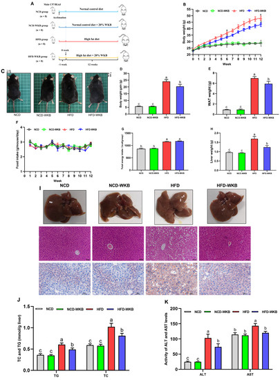 WKB improved the obese phenotypes and liver function in HFD−fed mice. (A) Illustration of animal experimental design. (B) Body weight changes. (C) Representative appearance of mice. (D) Body weight gain. (E) White adipose tissues (WAT) weight. (F) Food intake changes. (G) Total energy intake. (H) Liver weight. (I) Morphology (top, 200 × magnification), H&E, and Oil Red O staining (bottom, 400 × magnification) of the representative livers. (J) TG and TC contents in the livers. (K) ALT and AST levels in the serum. The different letters on the top of graph bars represented statistical significance (p < 0.05).
