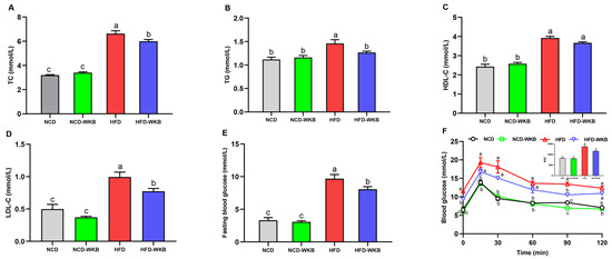 Effects of WKB on the serum lipid profiles, fasting blood glucose, and OGTT in HFD-fed mice. (A) TC. (B) TG. (C) HDL-C. (D) LDL-C. (E) Fasting blood glucose. (F) OGTT. The means marked with different superscript letters represent statistical significance (p < 0.05).