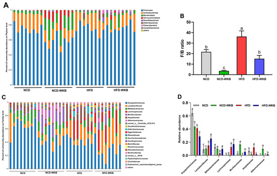 To further elucidate the effects of WKB on the gut microbiota composition, the main differences at the phylum, family, and genus levels were analyzed. At the phylum level, Firmicutes, Bacteroidota, Actinobacteriota, and Verrucomicrobiota were found to be the most dominant phyla in the four groups (Figure 4A). Although no significances were observed in these bacterial phyla between the NCD and HFD groups, WKB significantly increased the relative abundance of Bacteroidota and Verrucomicrobiota compared with those of the HFD group (Figure S2). Furthermore, the remarkable up-regulated Firmicutes/Bacteroidetes (F/B) ratio in HFD-fed mice was significantly reduced by WKB (Figure 4B). Consistent results were also found between the NCD and NCD-WKB groups. At the family level, the relative abundance of Lactobacillaceae, Bifidobacteriaceae, Muribaculaceae, and Akkermansiaceae in the HFD-WKB group was significantly higher than those of the HFD group, while the relative abundance of Erysipelotrichaceae and Atopobiaceae was markedly reduced after WKB intervention (Figure 4C,D).