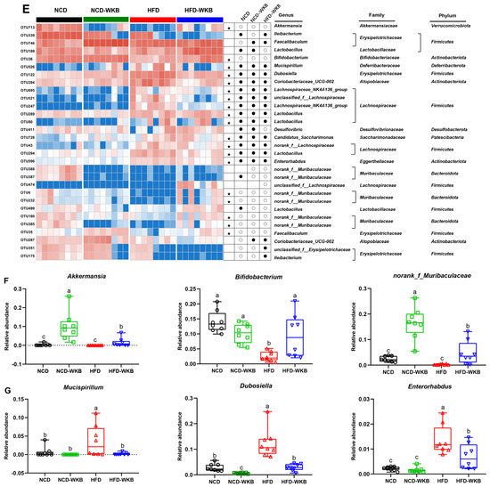 Effects of WKB on gut microbial community. (A) Phylum−level. (B) Firmicutes/Bacteroidetes (F/B) ratio. (C) Family−level. (D) Relative abundance of key gut microbiota at the family level. (E) Heatmap of the most changed 30 OTUs. (F,G) Relative abundance of key genus. The relative abundances of OTUs in the NCD or HFD−WKB groups were higher and lower than those in the HFD group, represented by white circles (○) and black dots (●), respectively. When the relative abundance of OTUs in the NCD group was changed by HFD and then reversed by WKB, it was marked with a black star (★). The different letters on the top of graph bars represented statistical significance (p < 0.05).