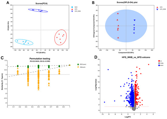 Microbial metabolites are believed to be an intermediate phenotype that mediates interactions between the host and microbiome, thus providing a reliable and effective way for gut microbiota activity. In this context, it was hypothesized that the potential mechanism of WKB on ameliorating NAFLD was related to the fecal metabolites modulated by the gut microbiota. To evaluate the metabolic alternations in response to the gut microbiota and remodeled by WKB supplementation, an untargeted metabolomics analysis was performed to identify the changed fecal metabolites. The PCA data distribution revealed that the structure of these identified metabolite profiles was separated from each other among different groups (Figure 5A). Moreover, for the HFD and HFD-WKB groups, scores scattered plots of OPLS-DA between them, which exhibited a distinct separation in the mixed ion modes (Figure 5B). The further permutation test indicated that the models were very stable and highly predictable when explaining the metabolite variations between the HFD-WKB and HFD groups.