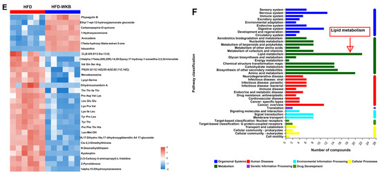 After the peak alignment and removal of unidentified peaks, a total of 1040 metabolites with definite information (VIP values > 1.0, fold change > 1.0 or <1.0, and p values < 0.05) were identified between the HFD and HFD-WKB groups in both positive and negative ion modes. As shown in Figure 5C, compared with the HFD group, 318 and 722 altered metabolites in the HFD-WKB group were up-regulated and down-regulated, respectively (Figure 5D). Subsequently, the top 30 significantly altered metabolites caused by WKB were selected for heat map analysis (Figure 5E). WKB could effectively prevent the altered metabolic features caused by HFD, mainly including lipids and lipid-like molecules, organoheterocyclic compounds, organic acids, derivatives, and benzene. Moreover, to achieve a deeper understanding of the metabolic alterations in response to WKB supplementation, the metabolic pathway enrichment analysis was conducted using MetaboAnalyst based on the KEGG database. The results showed that those differential metabolites between the HFD-WKB and HFD groups were annotated into seven categories of KEGG metabolic pathways with lipid metabolism being the most significantly enriched (Figure 5F).