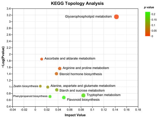KEGG topology analysis. The path impact value and p−value are reflected by the size and color of each circle, respectively.